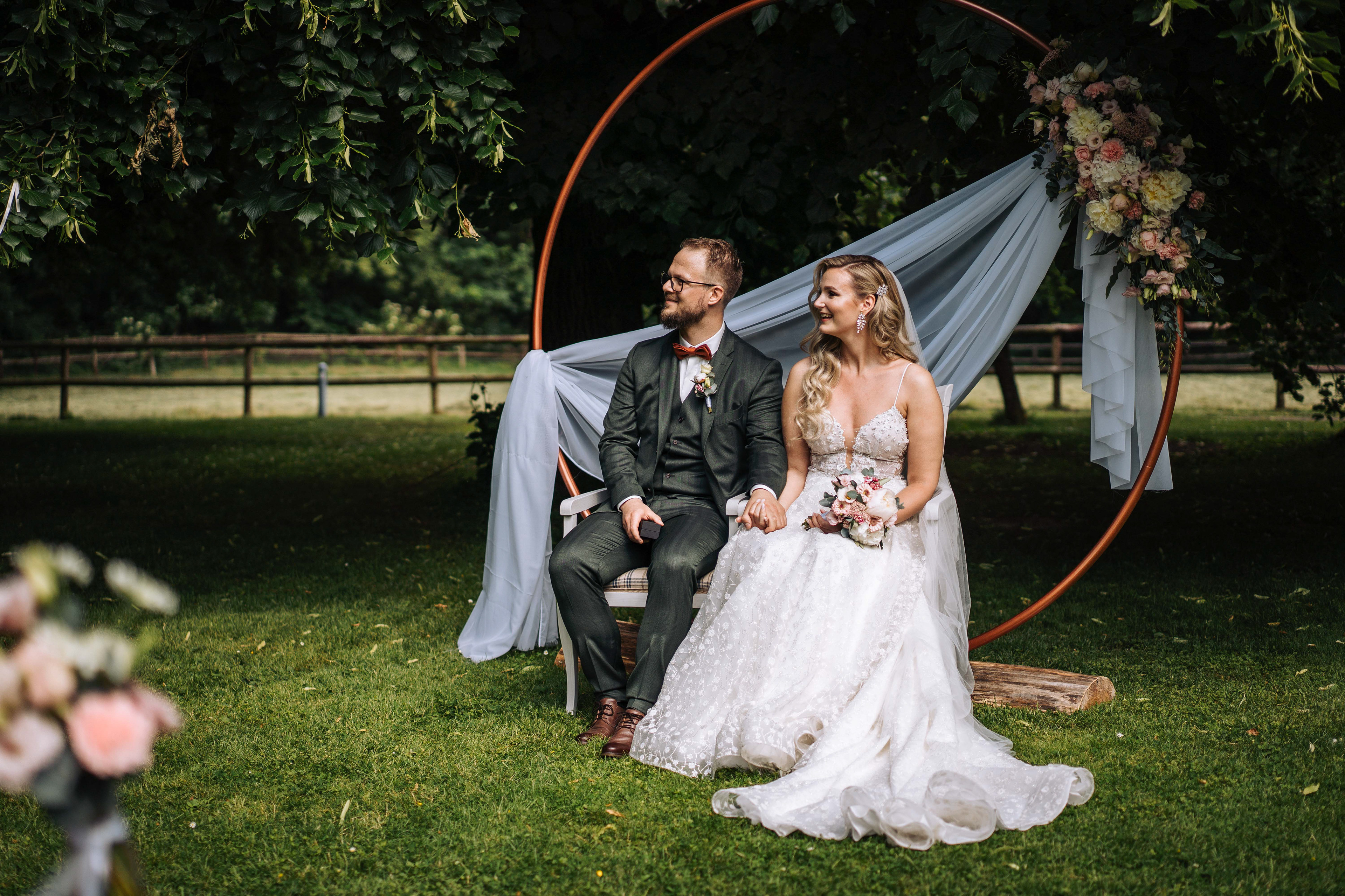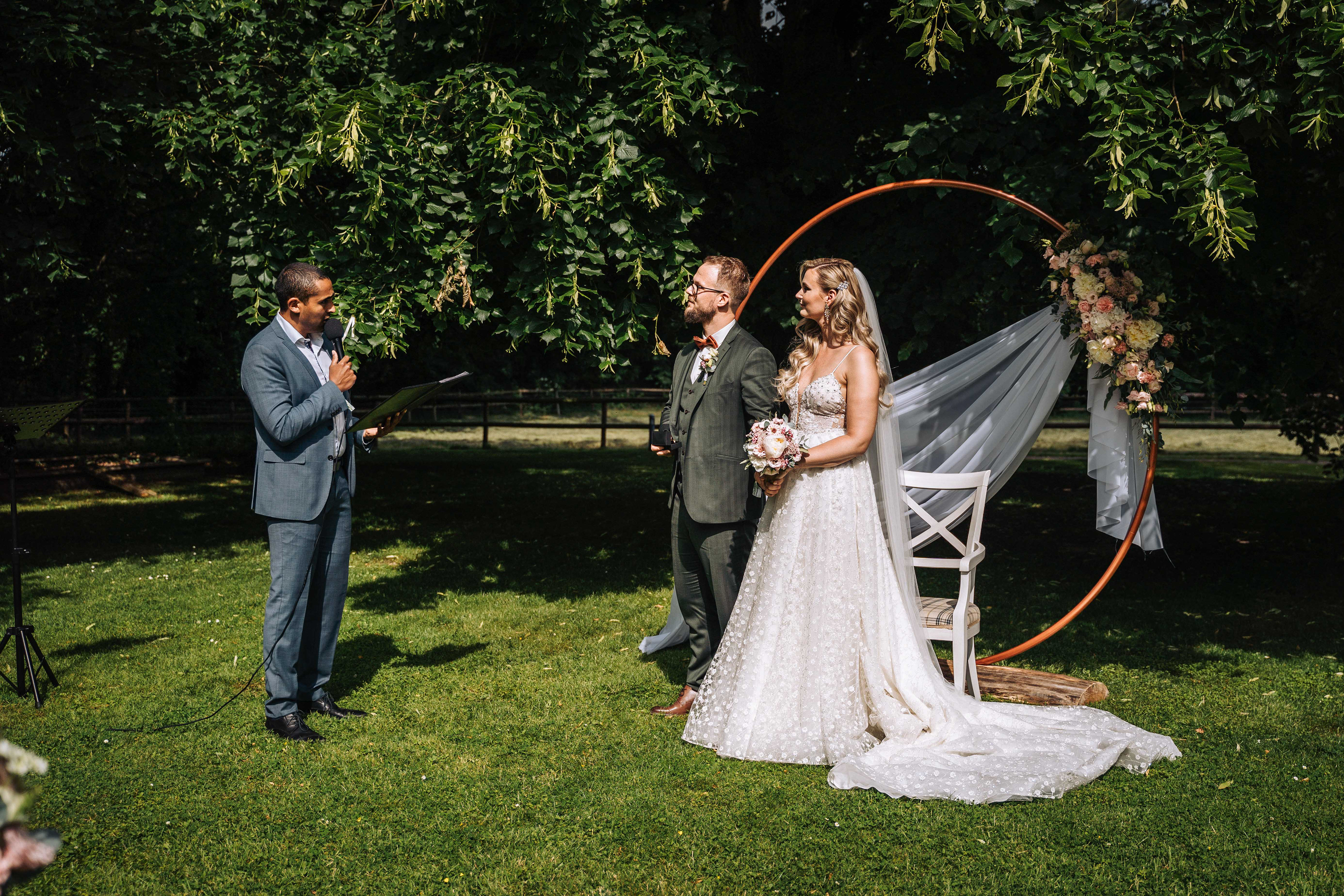 Auch bei der Gestaltung seid ihr deutlich freier als bei einer kirchlichen oder einer standesamtlichen Trauung. Und das sowohl bei der Wahl des Trauortes als auch bei der Deko. Wie wäre es zum Beispiel mit einem runden "Traubogen", wie ihn unser Hochzeitspaar gestaltet hat? Auch die Anordnung der Stühle müsst ihr natürlich nicht klassisch in Reihen belassen, sodern könnt auch einen Kreis oder Halbkreis wählen.