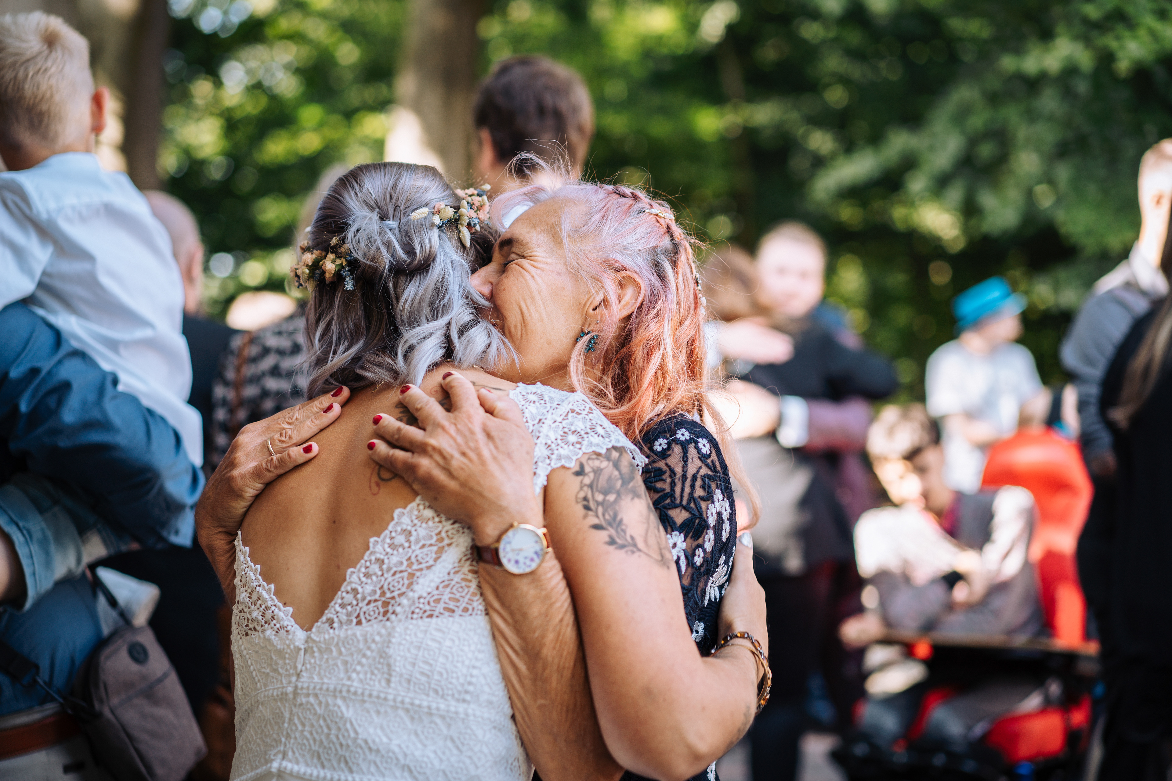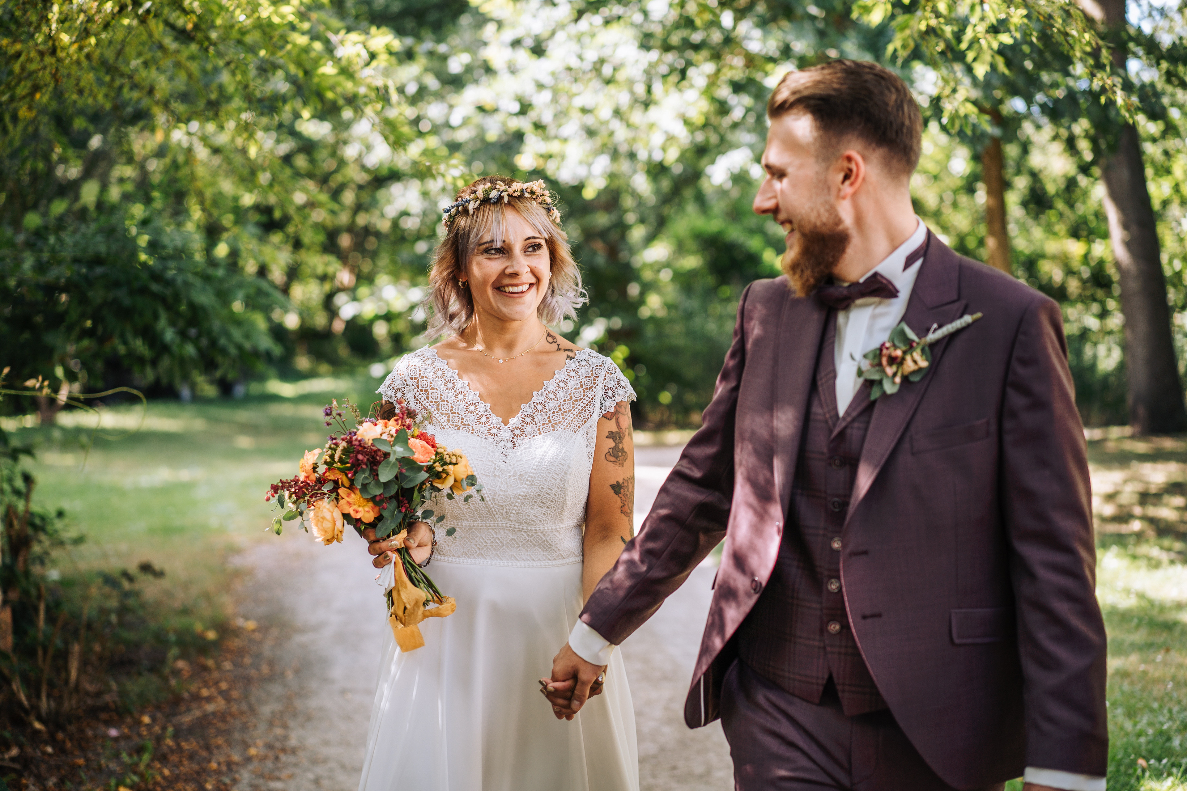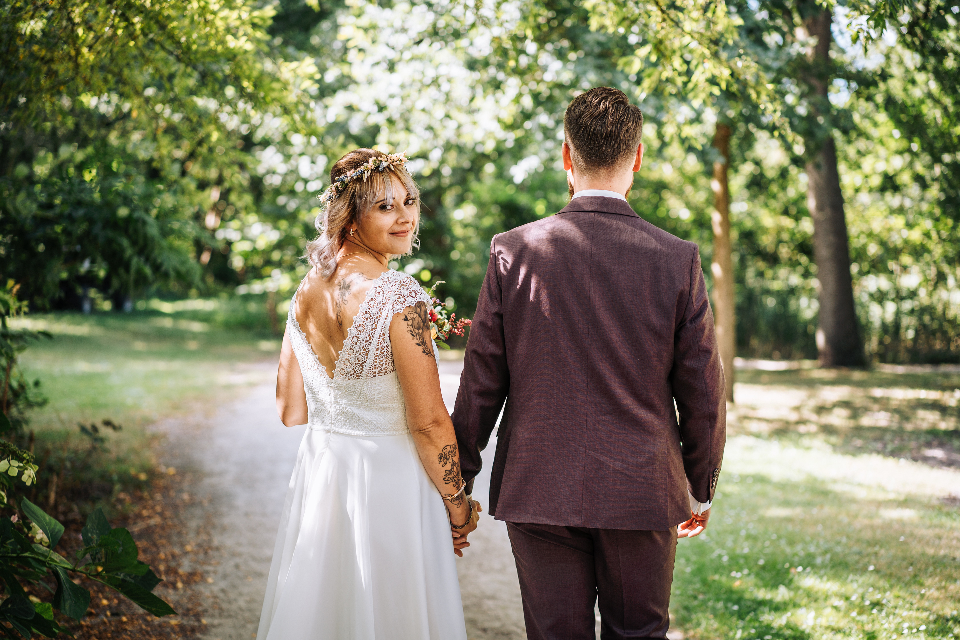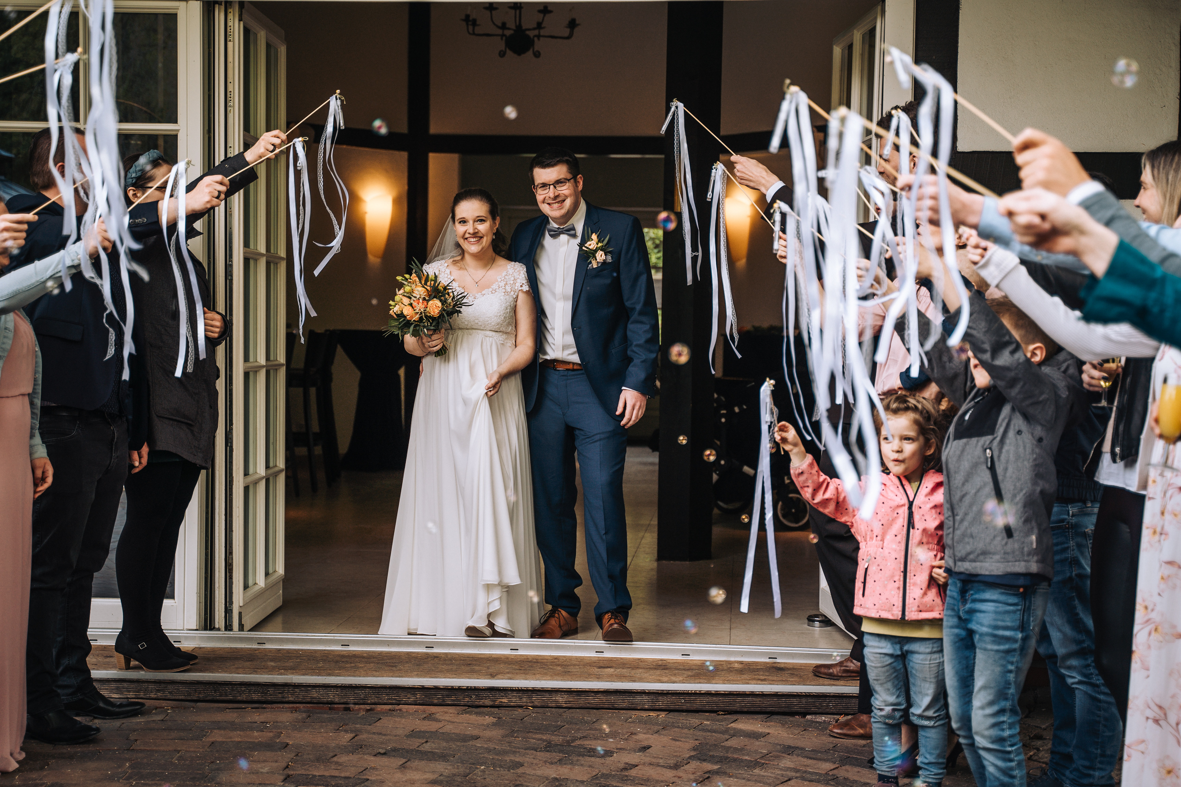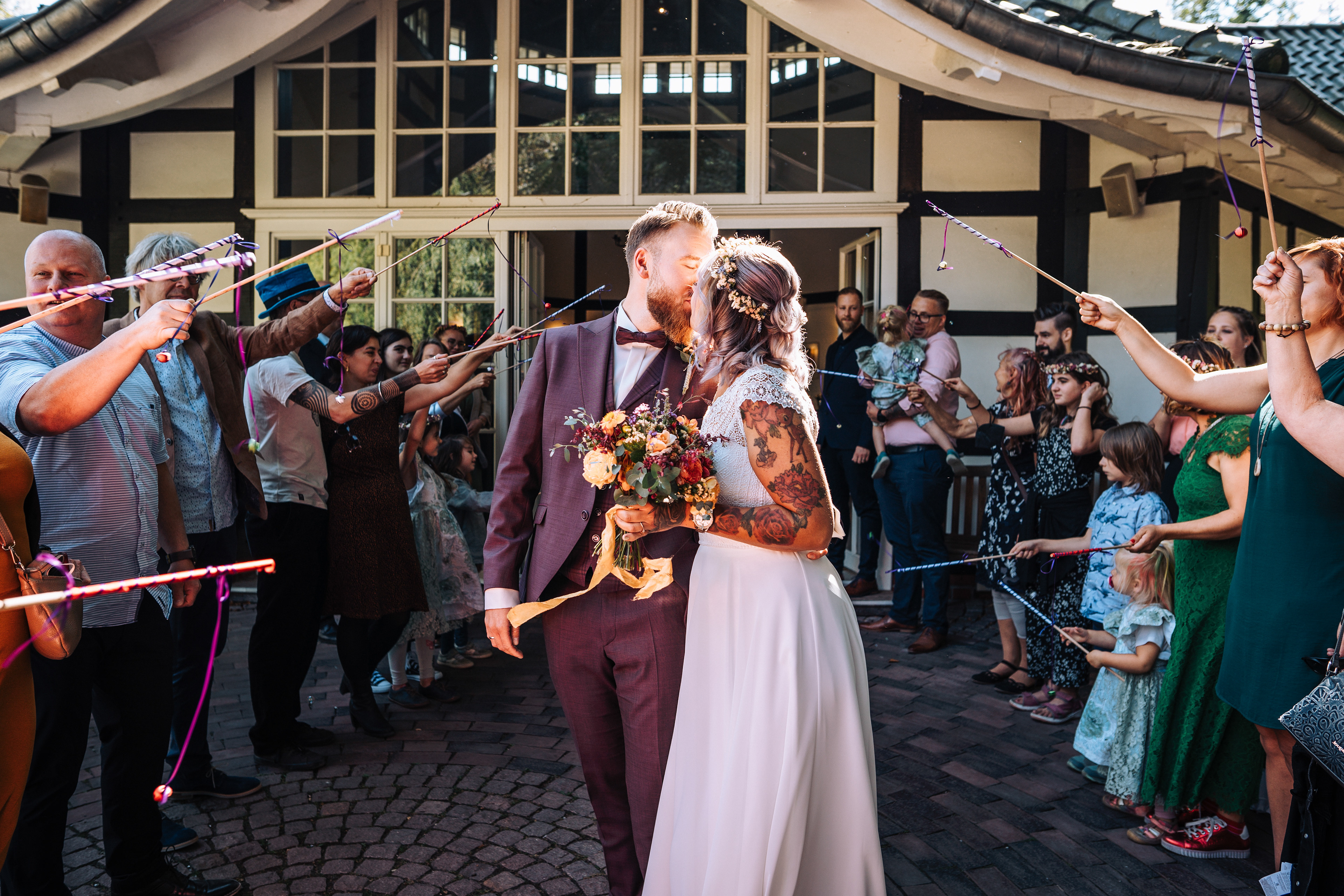 Um den Moment voll auszukosten und euch so richtig von euren Gästen feiern zu lassen, würden wir euch immer empfehlen einen Auszug mit Spalier zu planen! Das bietet wirklich schöne Fotomotive und ihr werdet aus dem Strahlen nicht mehr rauskommen, wenn euch alle Gäste aufgereiht beim Auszug begrüßen. Am Besten bittet ihr eure Trauzeugen passende Acccessoires zu verteilen, zum Beispiel Siefenblasen oder Wedding Wands (das sind die schön dekorierten Stäbe, die ihr hier auch auf einigen BIldern sehen könnt.
