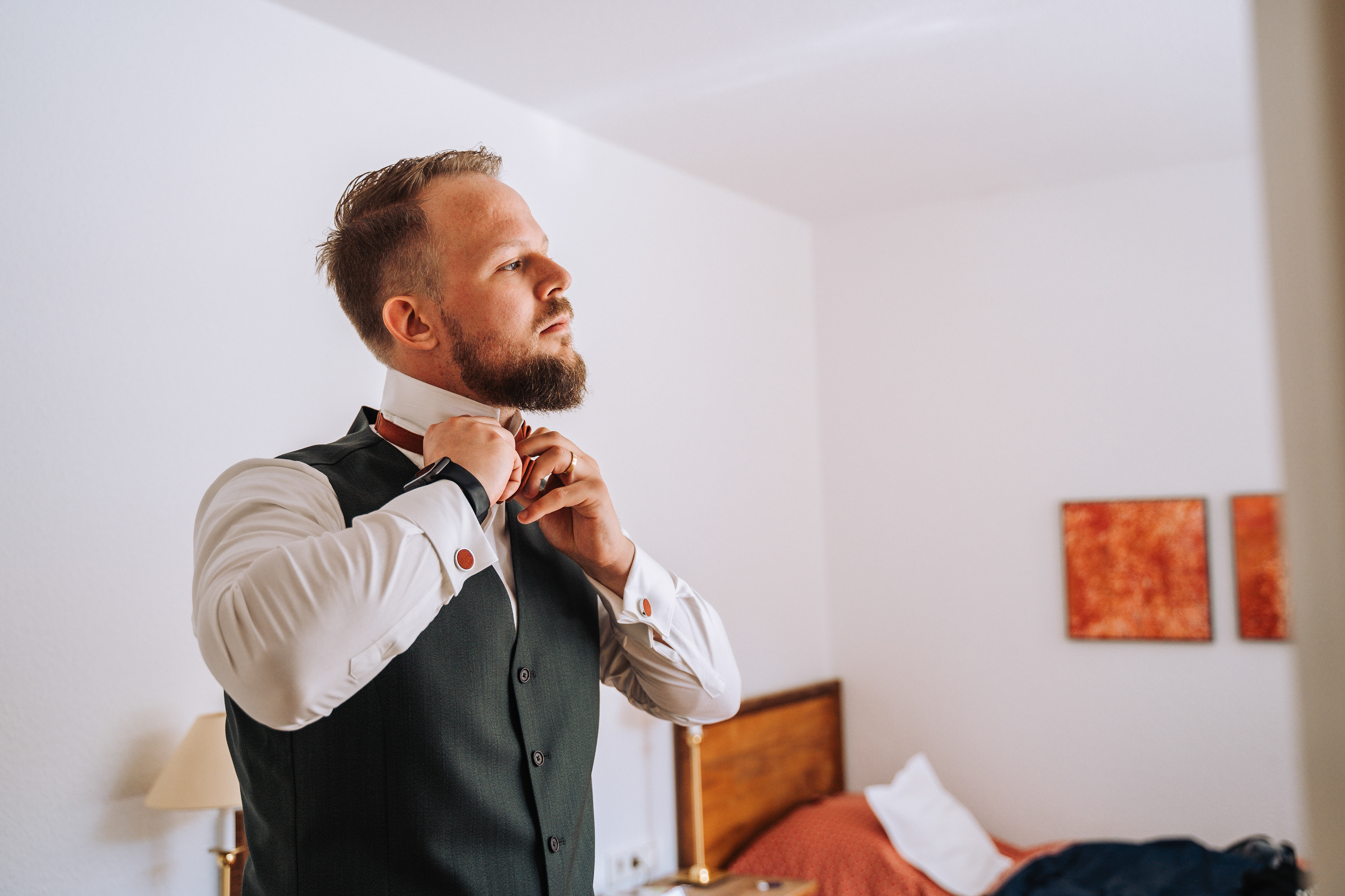 Beim Getting Ready an eurem Hochzeitstag können unglaublich gefühlvolle und detailreiche Aufnahmen entstehen. Man spürt bereits eure Vorfreude und Nervosität, gleichzeitig herrscht aber quasi noch die Ruhe vor dem Sturm. Außerdem bietet uns das Getting Ready die Möglichkeit, sämtliche Details eurer Outfits wie Schmuck, Blumen, Manschettenknöpfe und weitere Accessoires festzuhalten.