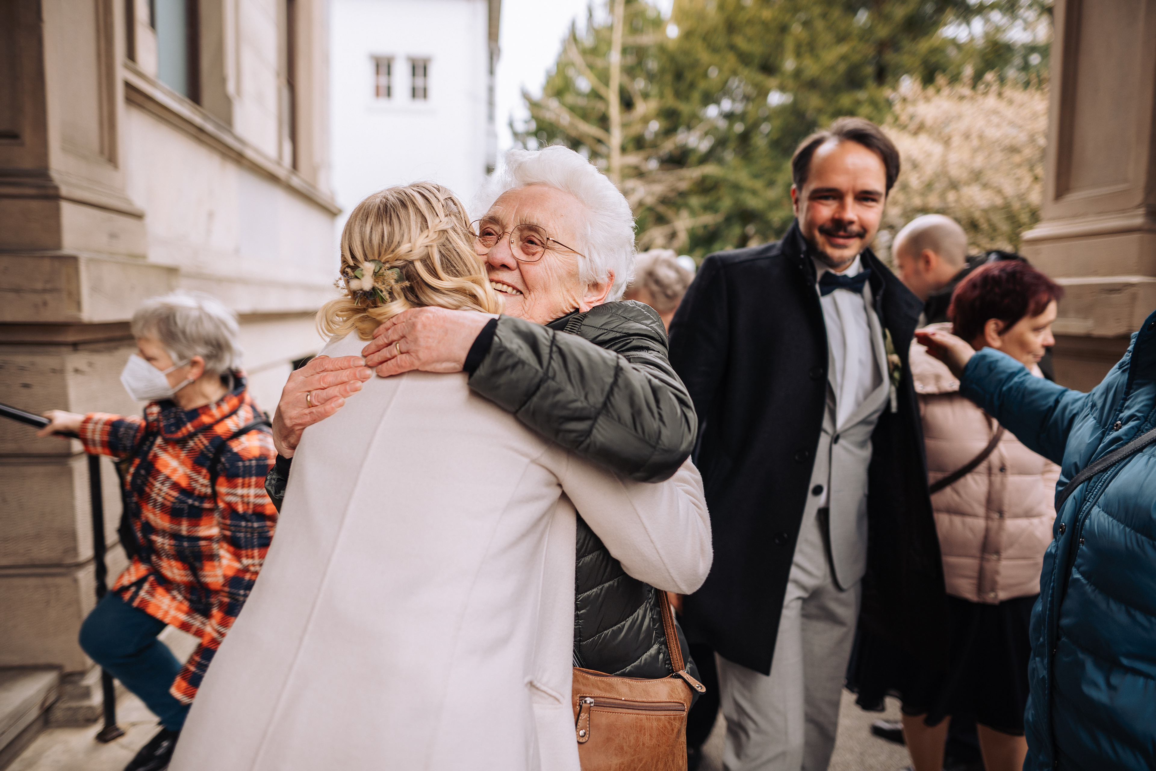 Auch die Gruppen- und Familienbilder kann man sehr gut auf der Treppe oder an anderen Stellen vor dem Gebäude machen. Offiziell ist es nicht erlaubt Stehtische oder Ähnliches für einen Sektempfang vor dem Standesamt aufzubauen, wir haben aber noch nie erlebt, dass es da Probleme gegeben hätte ;-)